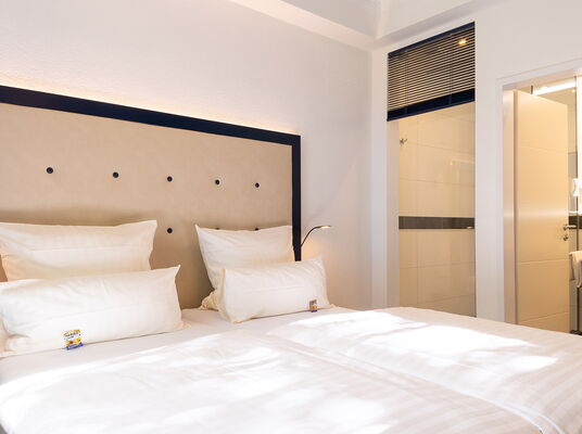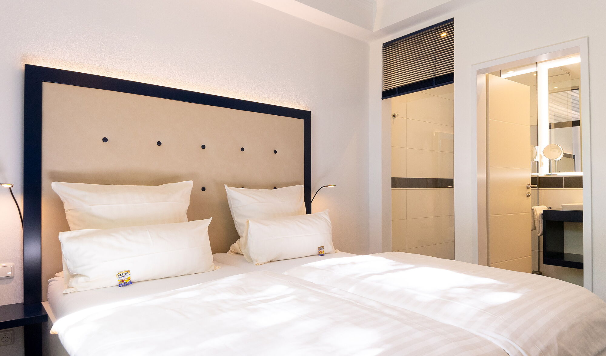 großes Doppelbett | 22-25m² | modern & hochwertig ausgestattete Zimmer | großes Bad mit Regenwalddusche